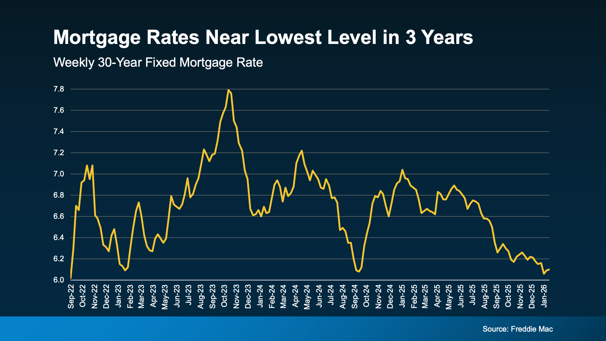 3-Year Lows: Rates have steadily declined from nearly 8% in late 2023 to the low 6% range as of early 2026.
